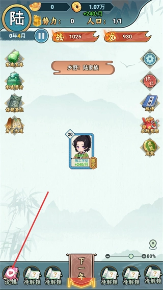 1、在乡野陆家族界面,点击左下角的说媒按钮,可进入对象一览界面,开启家族联姻的前期操作流程。