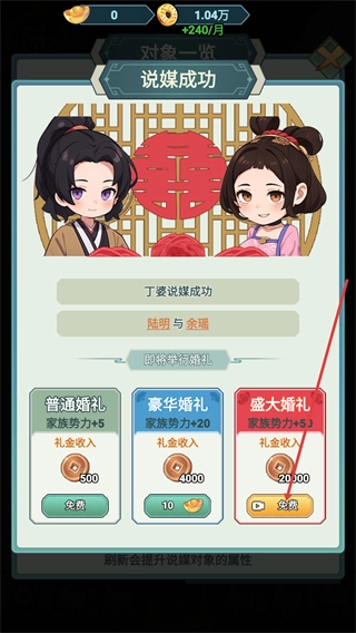 4、说媒成功后进入婚礼选择界面,点击盛大婚礼按钮,可获得对应家族势力加成与礼金收入。