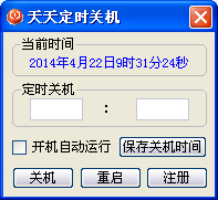 天天定时关机下载 1.2 绿色免费版 天天定时关机就是用于电脑定时关机和重启的一款小软件。很多人晚上用电脑看电影,看睡着了,电脑就一直开着到天亮,这样既好电又容易打搅到它人。用天天定时关机,只需设置对应时间,它就会自动帮你关闭。