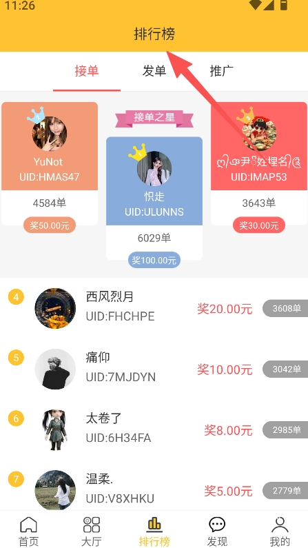 1、提供排行榜查看功能,可查看接单发单推广三类榜单的用户信息及接单量奖励。
