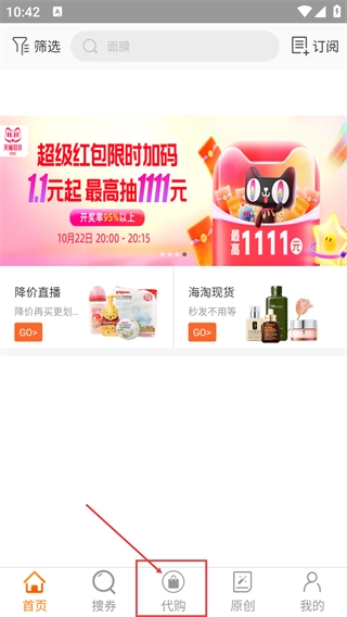 1、首页底部设有【代购】按钮,点击该按钮可进入代购页面,页面包含各类商品分类及现货推荐等内容。