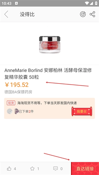 4、点击商品进入详情页,可查看【AnneMarie-Borlind-安娜柏林-活酵母保湿修复精华胶囊-50粒】的信息,点击【直达链接】可进行购买。