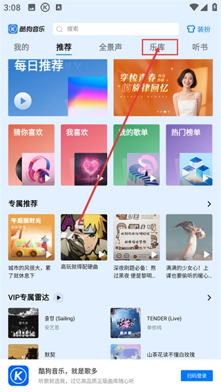 1、打开【酷狗音乐】进入推荐页面,点击顶部【乐库】标签,可进入汇聚海量音乐资源的核心板块。