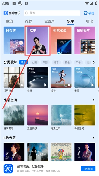 2、进入【乐库】页面后,点击【歌手】板块,能浏览各类歌手分类,快速找到目标音乐人。