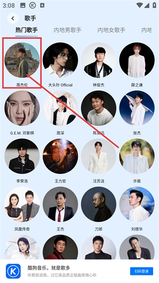 3、在歌手列表页面,点击【周杰伦】的头像,就能进入他的专属页面,查看完整的音乐作品。