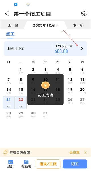 4、完成操作后,页面显示记工成功,日历中对应日期更新,点击工钱选项可查看具体情况。