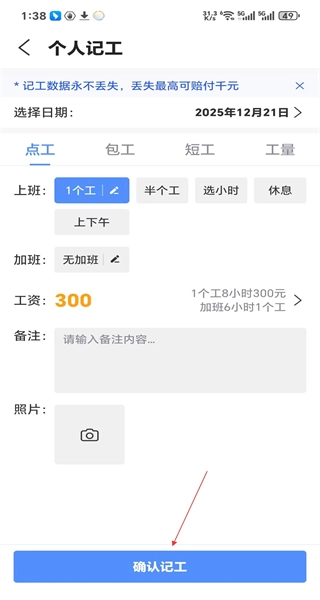 3、进入个人记工页面,选择上班时长为1个工,填写工资为300,确认信息后点击确认记工按钮。