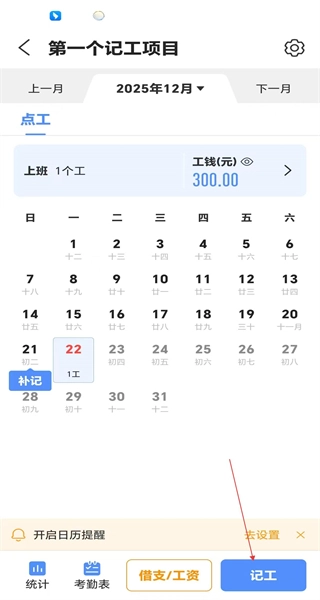 1、打开软件后,进入第一个记工项目页面,看到2025年12月的日历,点击记工按钮,准备补记工。