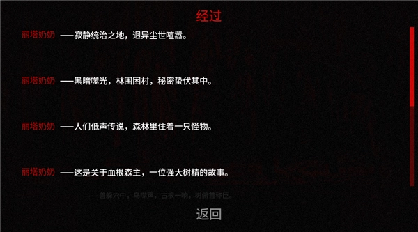 1、美术风格:采用浓烈的黑红色调对比,搭配炭笔质感角色立绘,关键恐怖场景以全屏插画形式呈现,强化视觉冲击。破败木屋、褪色玩具等细节渲染童年回忆,扭曲的树林路径暗示心理异化,营造出压抑与诡异交织的环境。