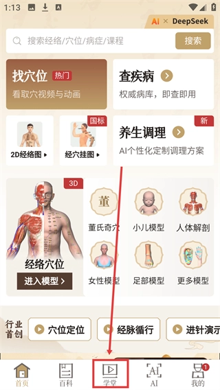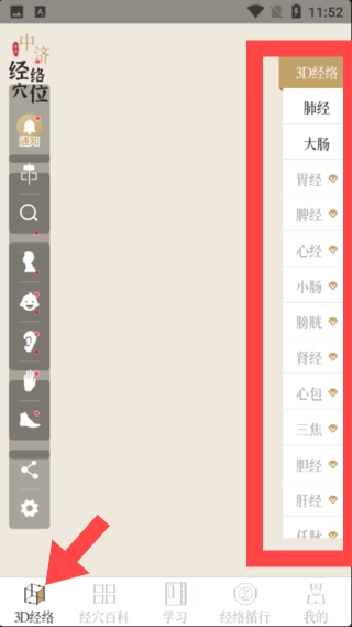 2、首页点击,左下角【3D经络】可以查看各种部位
