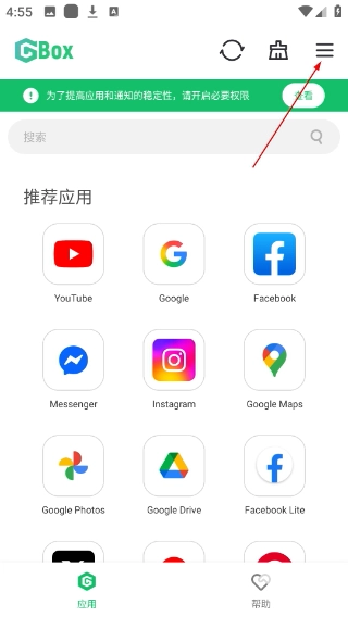 1、打开GBox应用,点击界面右上角的菜单按钮,展开功能选项列表。