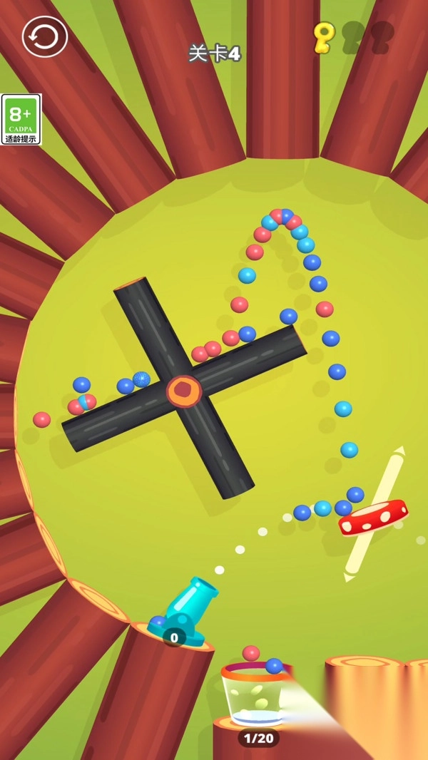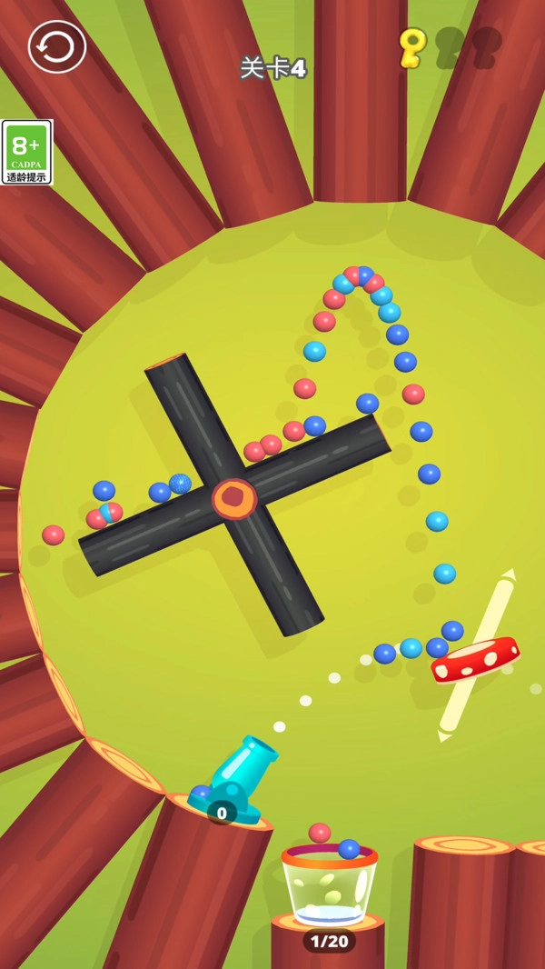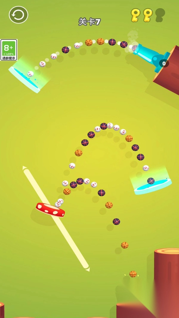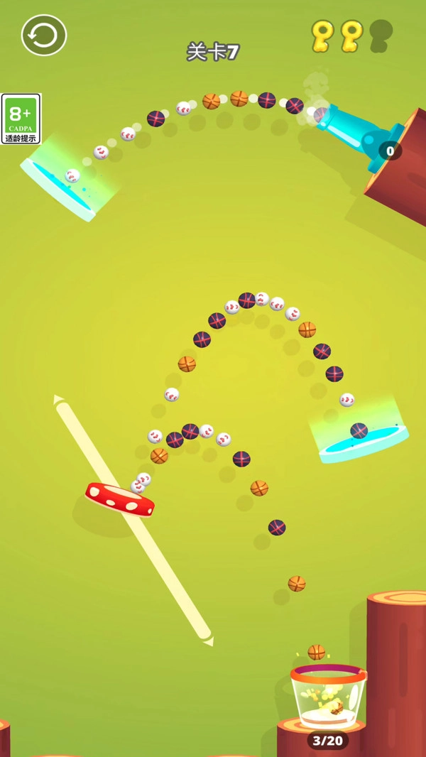 1. 通过拖动场景中的物体,如挡板、道具等,来改变球的弹射方向,使大炮发射出的球落入桶中,待桶装满后即可通关。