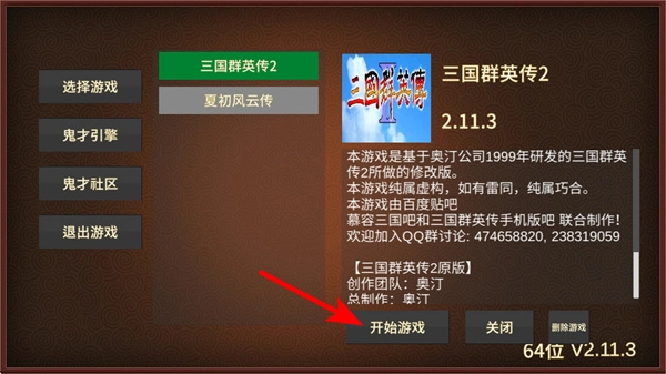 1、在游戏启动界面点击“开始游戏”按钮,即可进入《三国群英传2》的游戏流程,开启这场以三国为背景的策略冒险之旅。