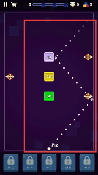 发射弹球后,弹球会沿着红框轨迹反弹,依次击碎【10】【20】【30】等砖块,以此积累关卡分数。