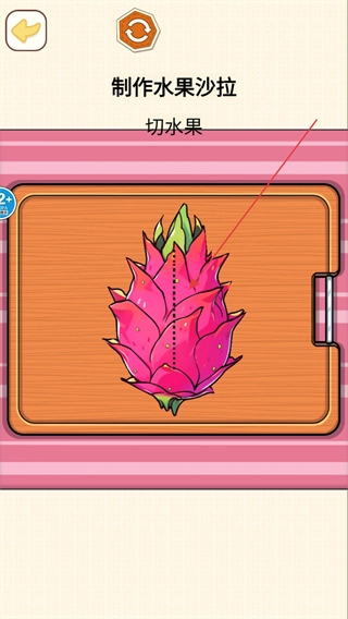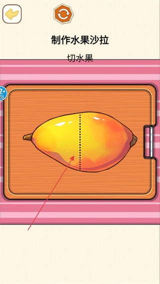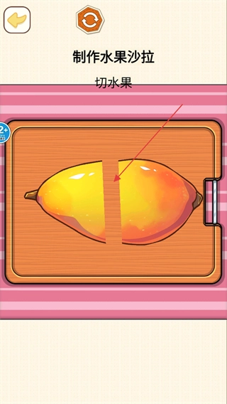 2、在切水果步骤中,对准芒果的切割线进行操作。