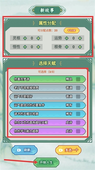 1、进入【新故事】界面后,把【20-可分配点数】加在灵根等属性上,选好天赋(比如史诗级天赋),再点击【开始人生】就能进入游戏了。