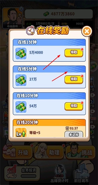 在在线奖励页面,依据在线时长点击领取按钮,即可获得相应的金币奖励,以此积累经营所需的资源。