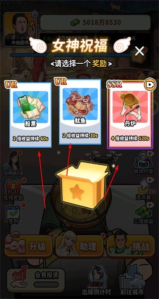3、进入女神祝福界面后,挑选对应的奖励,就能获得收益加成类道具,以此提升经营收益的能力。