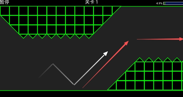 1、从第一关着手,熟悉箭头跳跃的操作手感以及基础的波浪运动规律,通过多次尝试来把握点击节奏和跳跃高度之间的关联。