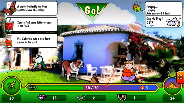 1、先查看场景给出的提示,接着点击Go!按钮来推进流程,此时进度会更新到30/70,并且会相应消耗食物。