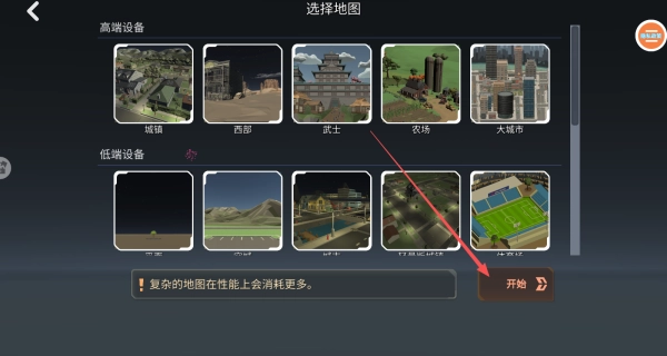 2、依据设备性能来选择适配场景,配置较高的设备能够开启大城市这类复杂地图,配置较低的设备则可选用城镇这类轻量化场景。