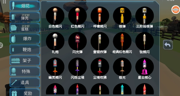 3、在丰富多样的烟花品类里挑选自己钟爱的类型,后续还能解锁更多特殊款式,以此让表演的视觉层次更丰富、效果更出彩。