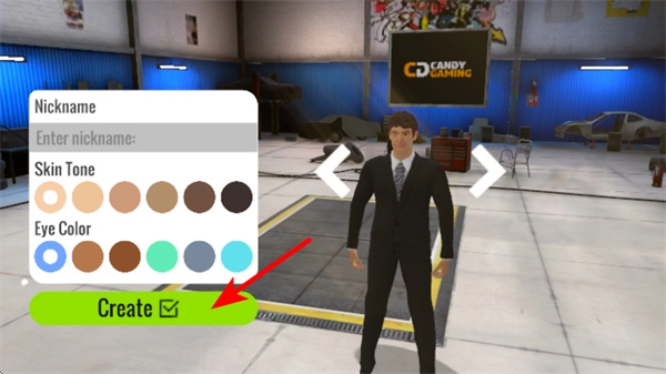 在角色创建界面,首先设置好昵称,接着选择肤色、眼睛颜色等外观选项,调整完毕后点击“Create”按钮,即可完成角色创建并进入主玩法场景。