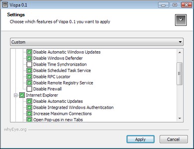 Vispa V0.6.3 英文绿色免费版 Vispa是一款Windows Vista的小工具,可以更好的优化隐私以及安全功能,设置可以改善系统性能。