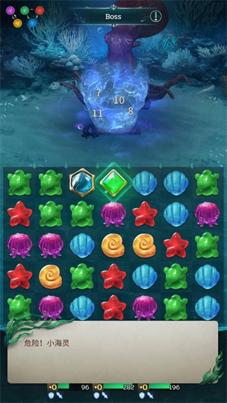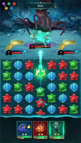 1、战斗时不同颜色的棋子分别对应不同的海灵属性,它们之间存在克制关系,消除棋子时需要动动脑筋;