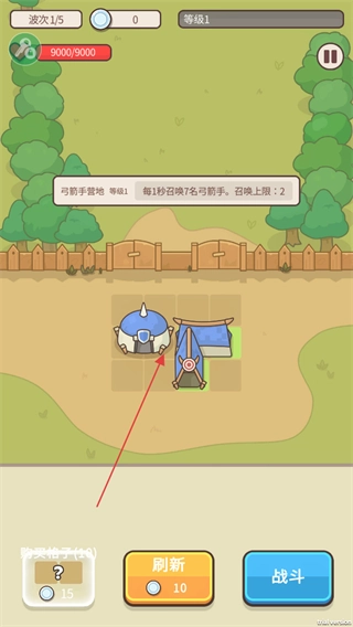 1、留意提示,系统每隔15秒会召唤1名弓手,召唤数量最多为2名,接下来准备部署堡垒进行防御。