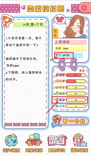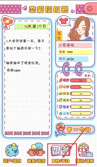 1、大学开学首日参与抽奖活动,中奖后获得【存款+500】的奖励,当前扮演的角色为【上官涵瑶】,其属性包含【智商-20】,可以点击页面底部的【工作/学习】按钮来推进剧情。