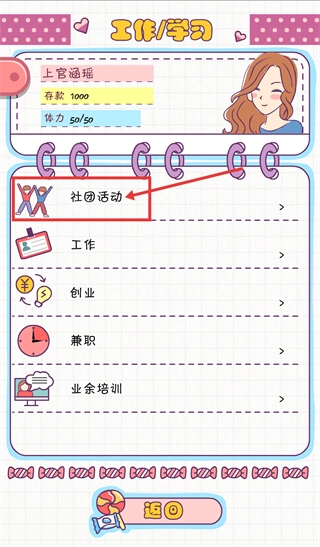 2、进入【工作/学习】界面后,可选择【社团活动】选项,当前【存款-1000】与【体力-50/50】均无变化,这是提升属性的可选途径之一。