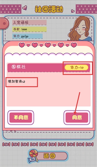 3、在【社团活动】板块选择【围棋社】,参与该社团需消耗【体力10点】,并可获得【智商提升2点】的效果,点击【同意】按钮即可加入该社团。