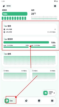 1、进入软件后,我们就能查看手机的使用情况、CPU信息以及使用率。