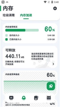 包含ROM与RAM的使用状态,同时配备一键清理功能以释放内存空间。