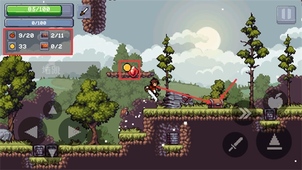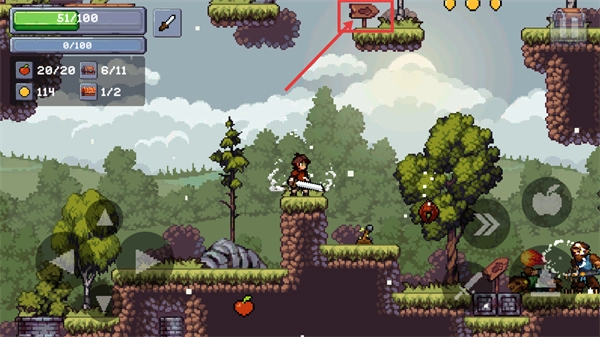 4、在平台场景里,操控角色移动至高处的【木牌】处查看信息,在此过程中需避开敌人并收集苹果道具,以确保生存安全与资源的获取。