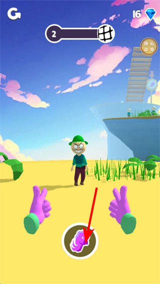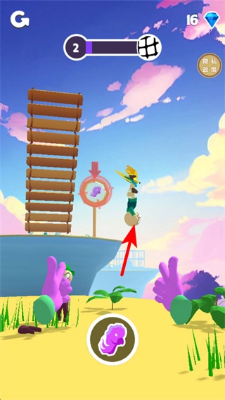 1、在游戏界面中,点击底部的紫色道具区域即可触发互动,这是启动角色弹射的关键操作,借助该操作能够推进关卡内的挑战进程。