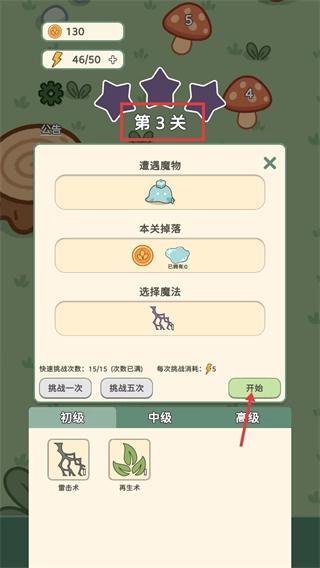 1、进入【第3关】,明确【遭遇魔物】的挑战目标,选定【雷击术】作为魔法,耗费【5】闪电后点击【开始】进入关卡。