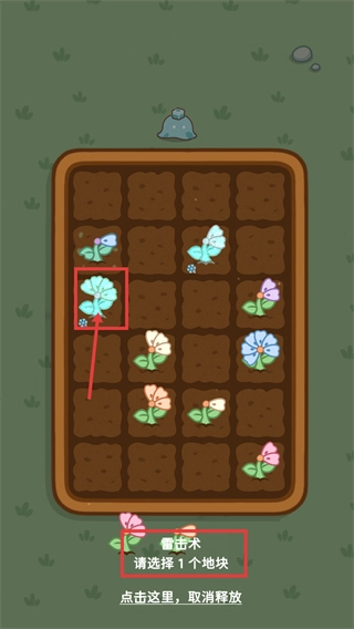 3、使用【雷击术】时,按照提示【请选择1个地块】,选中目标浅蓝色花所在的地块,即可完成魔法释放并消除对应的植物。