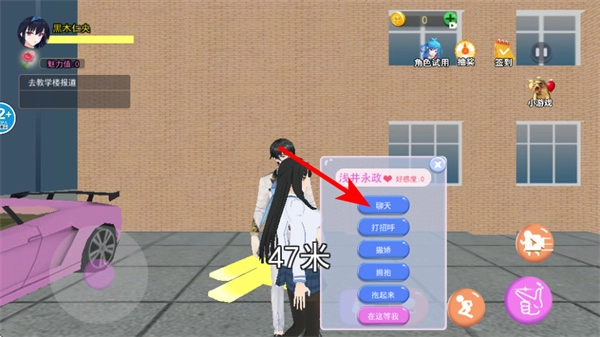 进入校园场景后,可点击界面右侧的攻击按键与其他角色进行互动,此时会弹出交互选项窗口,通过选择窗口中的选项,就能和角色开展聊天、互动等活动,从而提升角色对你的好感度。