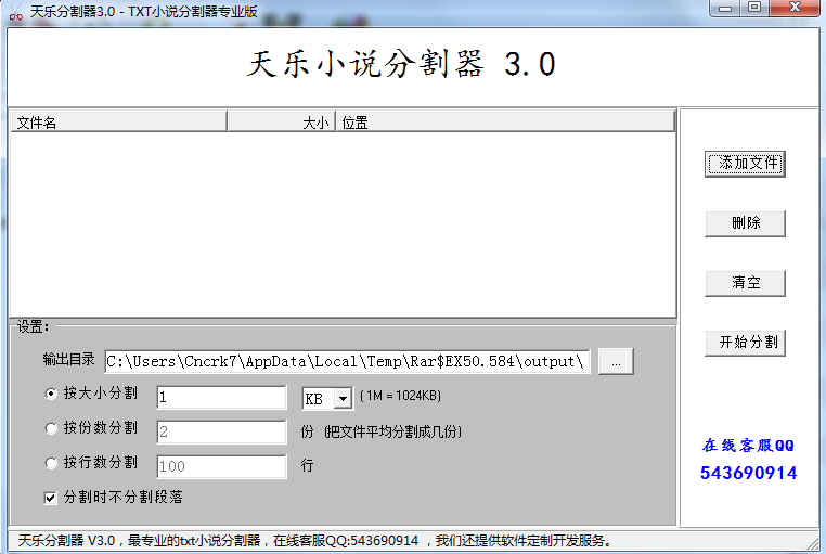 天乐小说分割器是一个专业的TXT小说分割器,可按您指定的文件大小、份数或行数,精准快速的分割TXT小说文件,使用方便。添加文件,然后设置下输出目录,最后点开始分割即可。