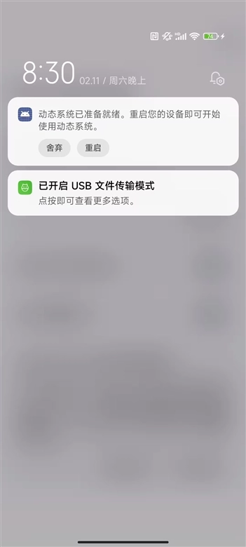5、安装完成后,下拉通知栏并点击【重启】按钮,就能进入双系统了。不过要特别注意!一定不要手动按开机键重启,那样只会重启手机原本的系统,必须点击DSU的重启选项才行【重要提示】:即使不解开BL锁也能操作,但这种情况下需要通过电脑进行ADB操作。
