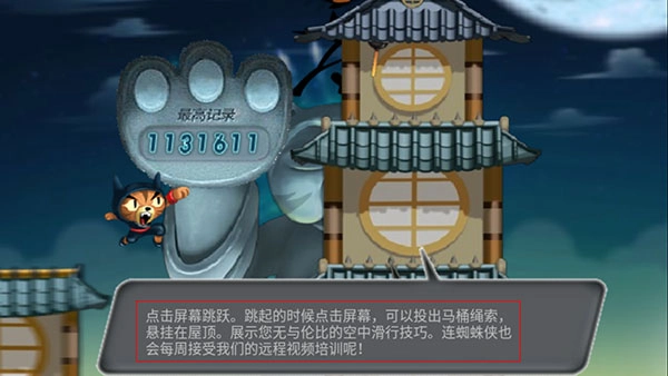 3、借助绳索吸附高层建筑,玩家能够更精准地把控忍者猫的跳跃方向,这让游戏的策略性与挑战性都得到了提升。