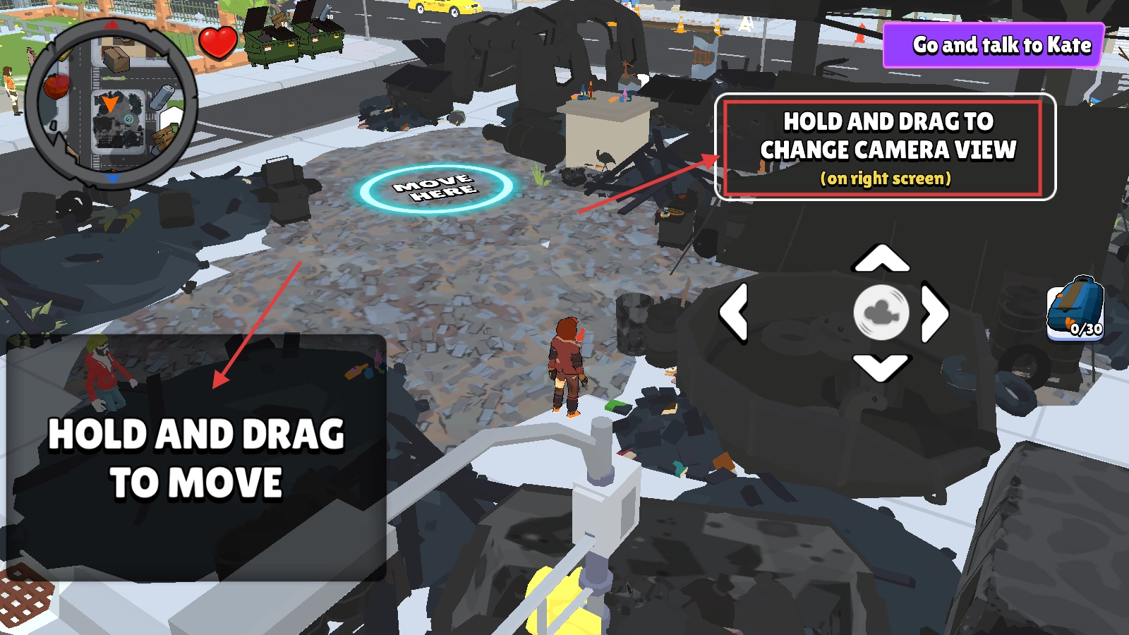 1、长按并拖动左侧区域可移动角色,右侧区域用于调整视角,请按照指引前往与【Kate】对话。