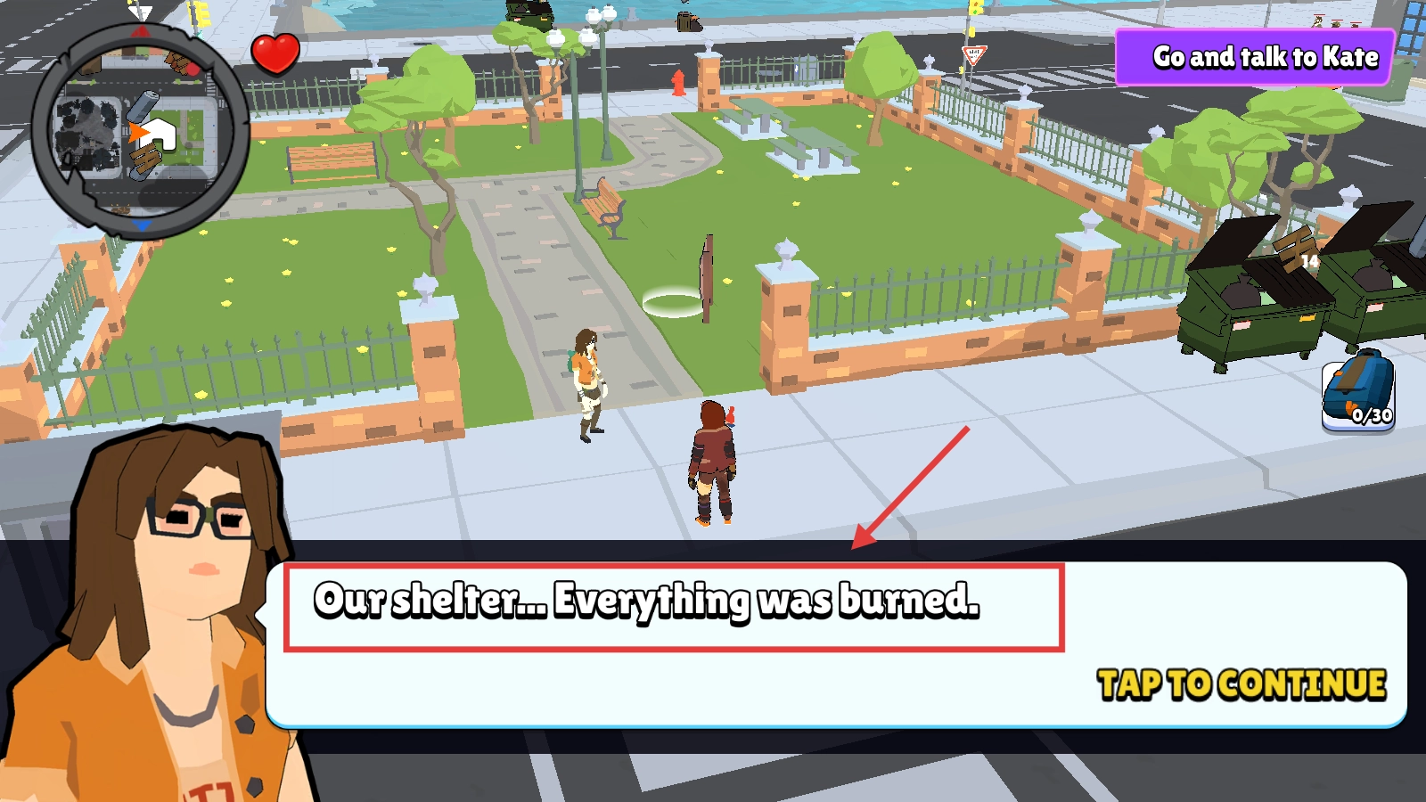 2、和NPC对话以了解庇护所被烧毁的情况,按照界面提示点击继续,从而获取后续的任务线索。