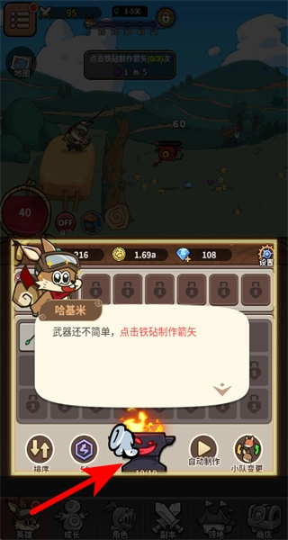 进入主界面后,按照提示点击底部的熔炉按钮来制作箭矢——这是获取战斗耗材的核心步骤,箭矢作为后续战斗不可或缺的资源,只有完成制作才能推动后续环节的进行。