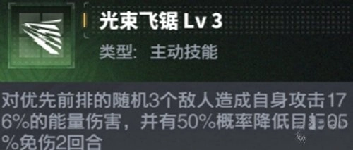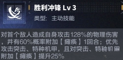 一技能对3个目标造成215%的物理伤害,二技能是单体475%伤害;并且二技能对低血量机甲额外有30%伤害提升,对突击/特种机体也有30%的伤害提升。