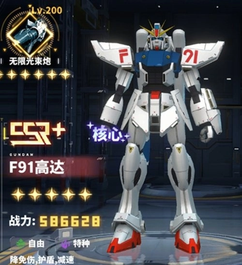 一技能有50%概率降低3个敌人25%的免伤效果,这里给新手解释一下:免伤属于比较珍稀的属性,它同时覆盖物理、能量以及异常伤害的减免,所以降低25%免伤是个强度很高的技能。大家要把控好速度节奏,让F91高达先出手降低敌人免伤,之后再让输出机体进行爆发攻击,就能打出非常高的伤害——务必记得给F91高达携带迅捷芯片。