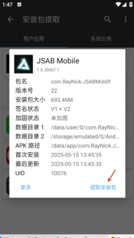 随后启动MT管理器应用,找到界面左上角的三横线图标并点击,在弹出的选项列表中选择“安装包提取”功能。