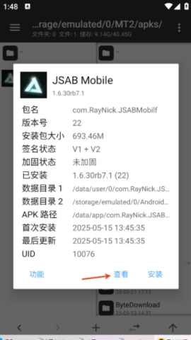 在右侧文件夹中依次点击Android、data、com.RayNick.JSABMobilf、files,最终界面如下图所示。